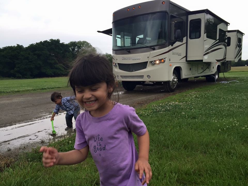 Morning was still chaotic but a bit better. Felt like we were getting the hang of things little by little. But London was up at 5:40am from time change and teething combo. Took kids to the playground (which was lacking) then hit the road. It was a long day of driving because we wanted to make up the extra hour we lost the day before. We successfully made it to St. Louis, MO and stayed in a suburb on the NW side so we could miss any morning traffic. We were very disappointed with the campground- it was basically a parking lot with patches of grass in between. Not our idea of camping! Amazingly, our “neighbors” there said they’d been there a month and were loving it!  Different strokes… The kids were a mess, and a storm was moving in, so we let them play while we grilled sausages, asparagus and peppers. We attempted to feed them and then it took forever to get them in bed. By the time they were both asleep, we agreed it was our turn too.
