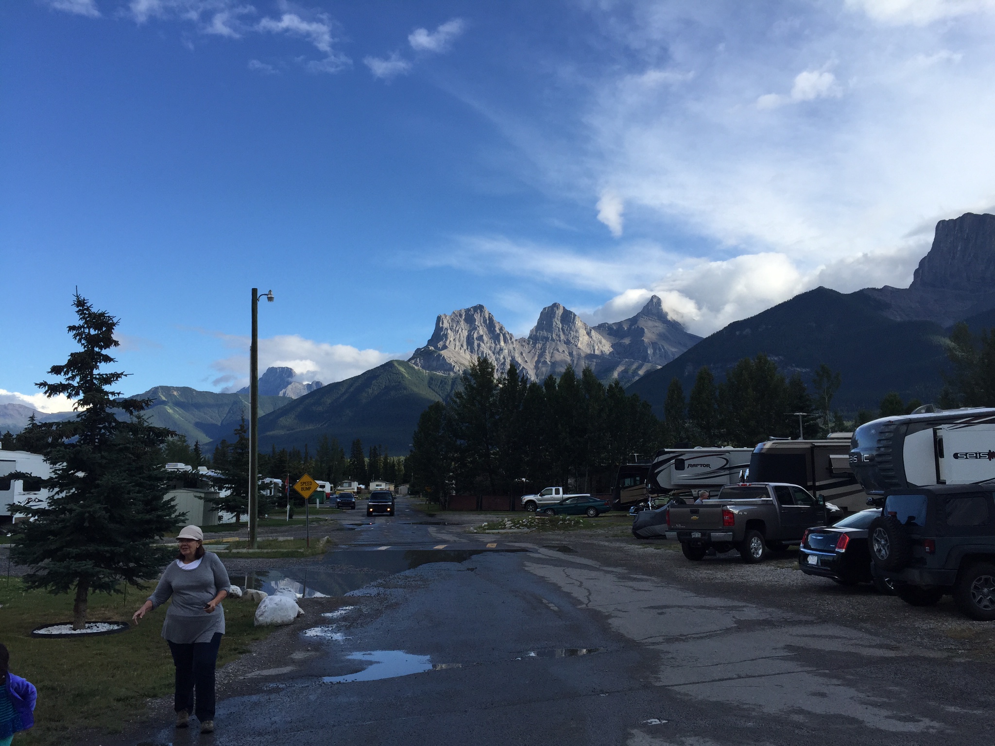 Canmore Spring Creek Resort: maybe 3 stars, but only because of the stunning views and the lovely/convenient walkway along a stream into the cute town center of Canmore. Poorly designed layout with tough turns, mobile homes as your main view instead of the gorgeous peaks regardless of where in the camp they place you, useless wifi, sites way too close together, built in fire-pits too close to neighbor so you basically risk setting their rig on fire and can likely only get chairs around half of pit, and no grassy area to walk your dogs. Nice playground for kids though.