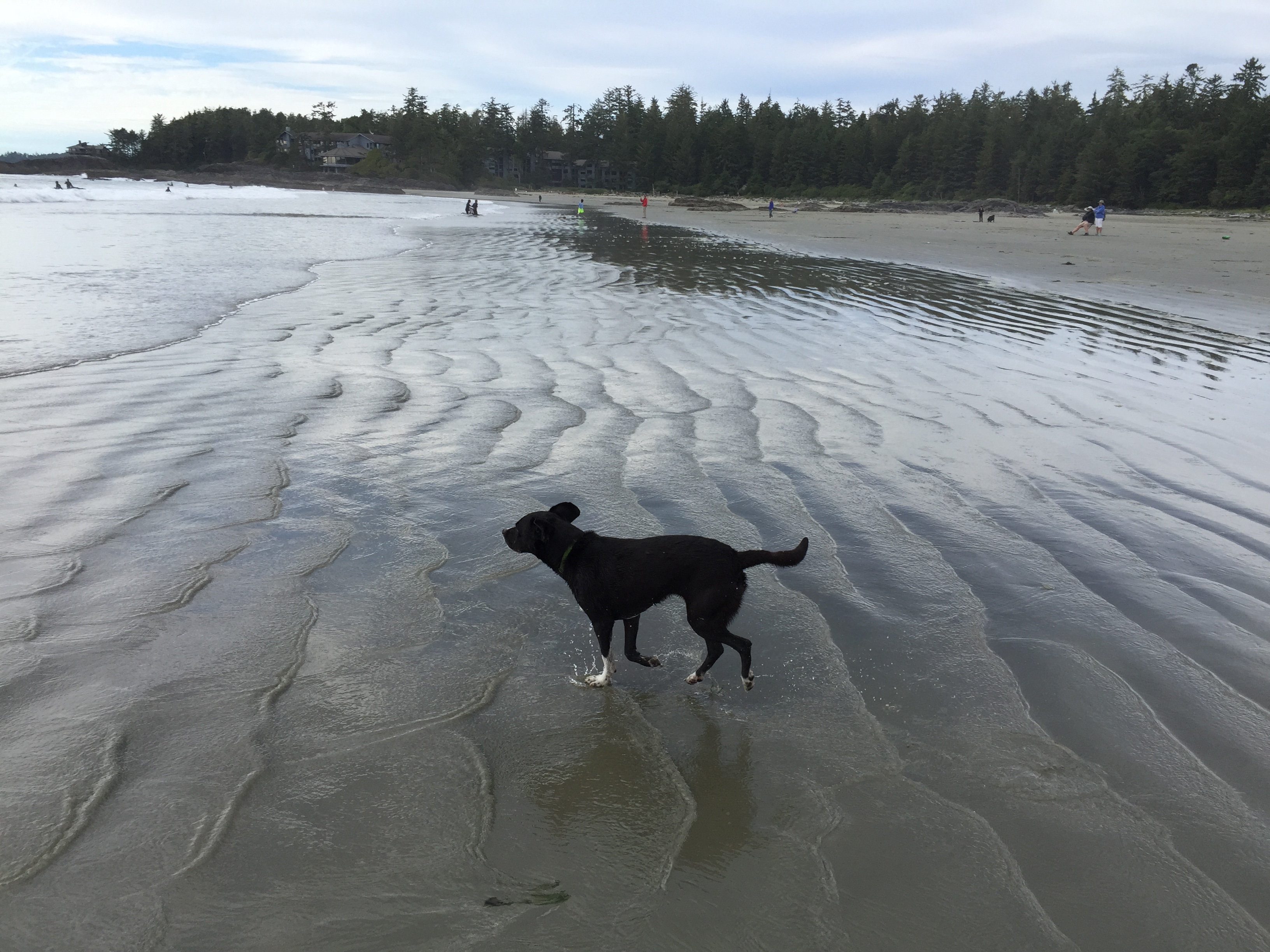 Well, surfers certainly know beauty – the beaches we explored were long and wide, the waves were decent and there were areas that rival Northeast US and New Zealand beaches with their rugged appeal and waves crashing against rocky shorelines. We watched newbie surfers on Chesterman beach as the dogs ran free and dipped our feet into the frigid waters at Tofino Beach.